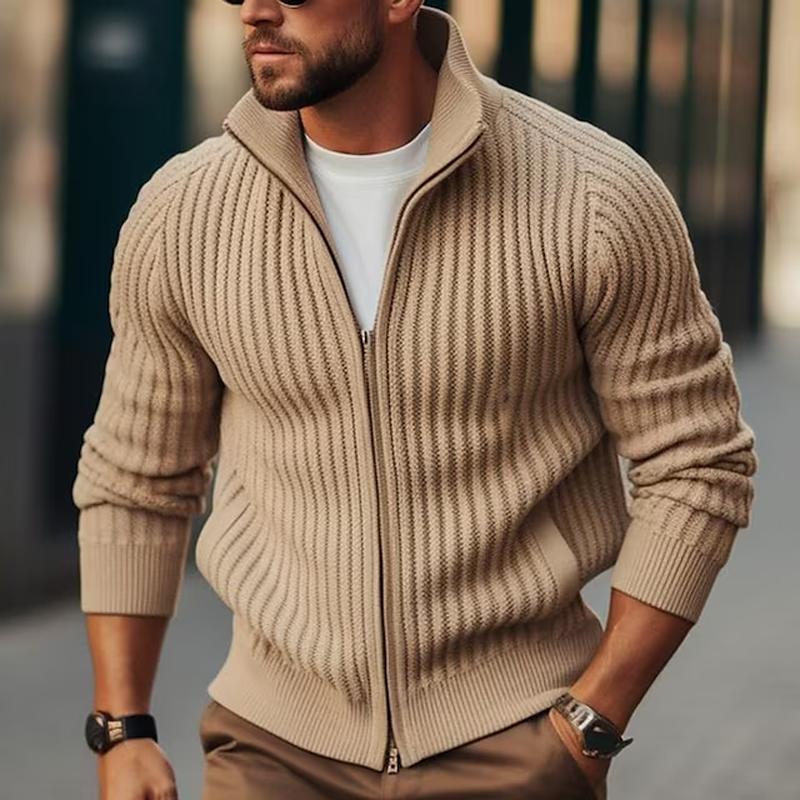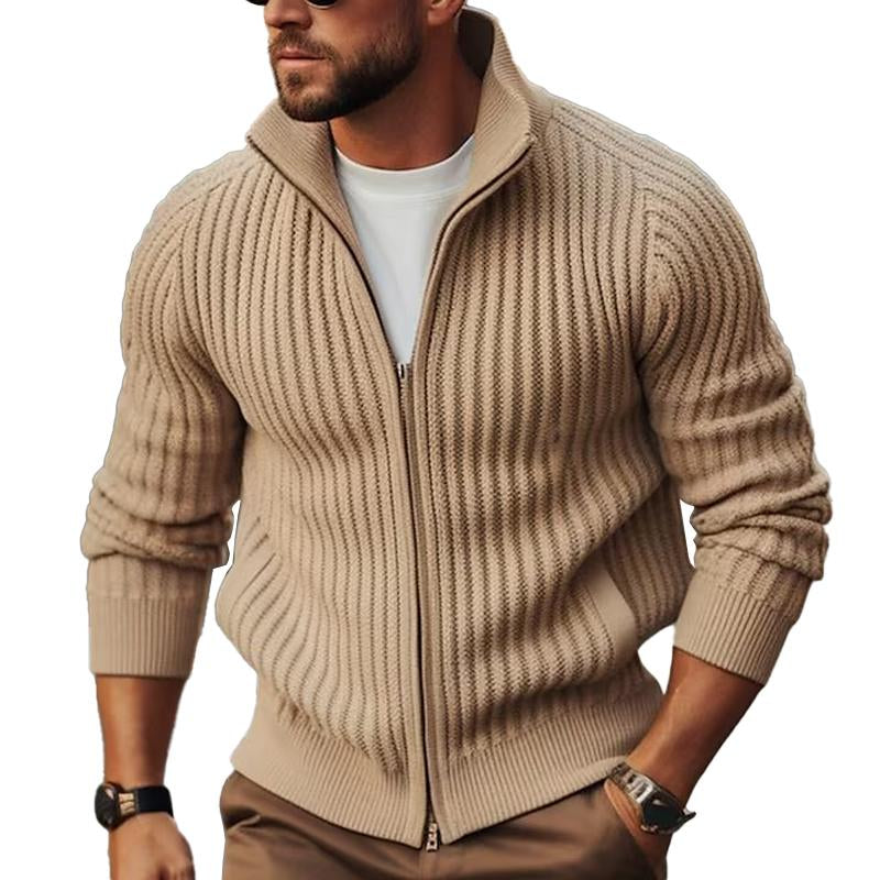 The Men's Casual Solid Color Stand Collar Zipper Knitted Long-Sleeved Cardigan effortlessly combines style and warmth.
