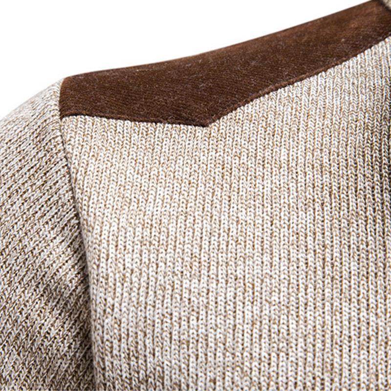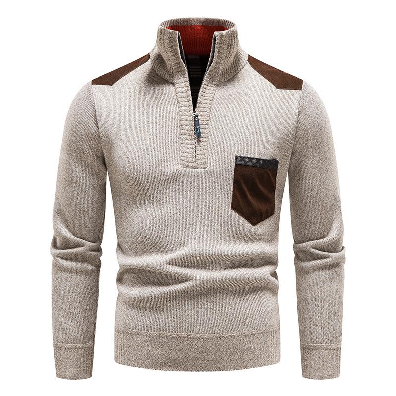 The pullover knitwear presents a sophisticated style, detailed with brown patch design on shoulder and brown check pocket for an eye-catching finish. This design is elevated by half-turtleneck and 1/4 zipper, reflecting a modern take on knitwear.