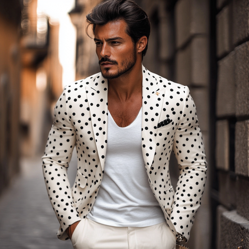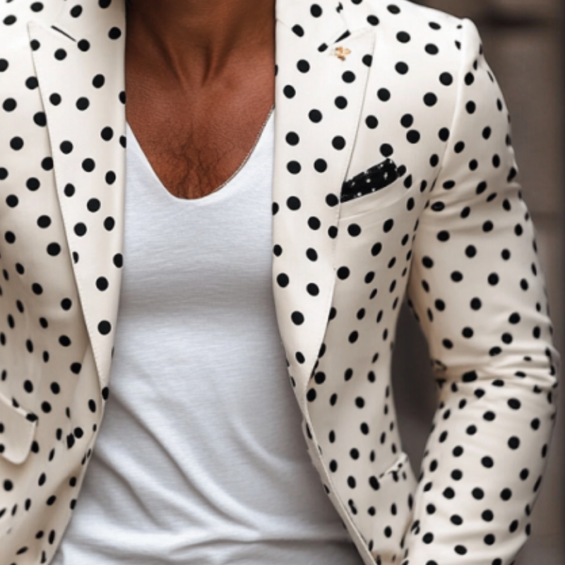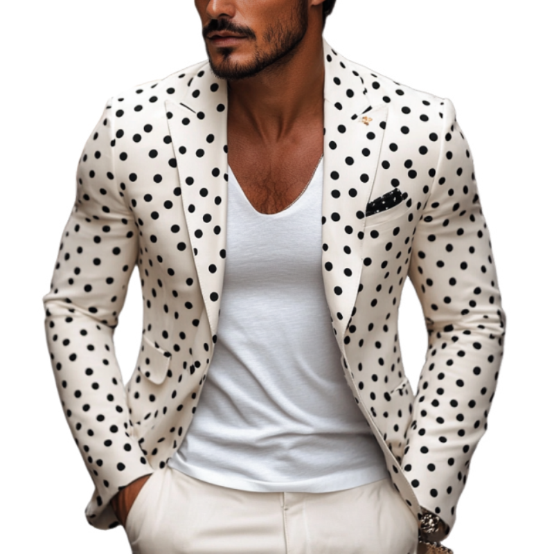 The Men's Stylish Slim Fit Polka Dot Peak Collar Blazer combines contemporary flair with classic sophistication. Featuring a slim fit and bold polka dot pattern, this blazer stands out as a versatile, fashionable piece for both formal and semi-formal occasions. Its peak collar adds a sharp edge, making it an ideal choice for modern, style-conscious individuals.