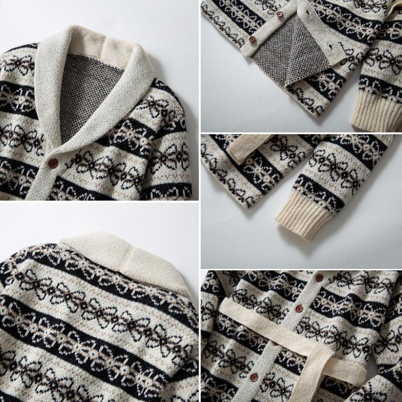 Men's Vintage Jacquard Thick Lapel Belt Mid-Length Knitted Cardigan