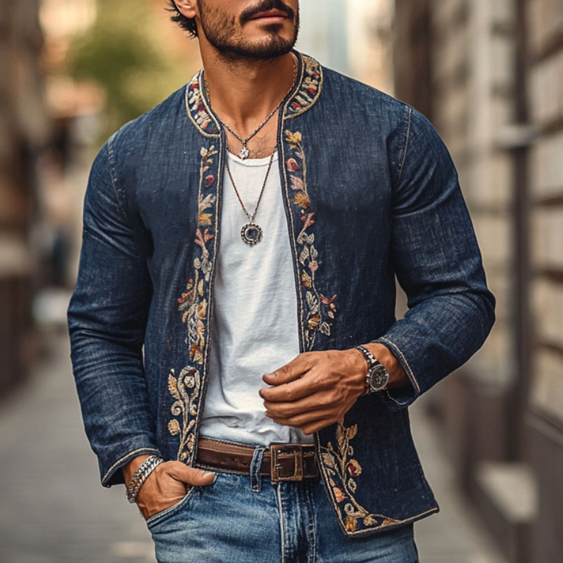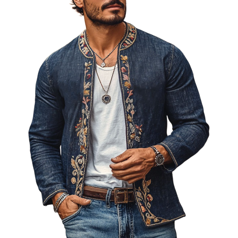 The Men's Vintage Round Neck Embroidered Slim Denim Cardigan effortlessly combines classic denim elements with modern style, making it a versatile addition to your wardrobe. Crafted from durable and soft denim fabric, this cardigan features unique embroidered details that add a touch of vintage charm. Perfect for layering, it can elevate both casual and smart-casual outfits.